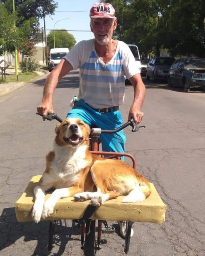The man pedals gently, always checking to make sure his little passenger is comfortable.