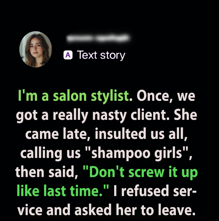 I’m Shiloh, 30. I work in a popular beauty salon.A couple days ago, a rude client walked in 25 minutes late. She looked annoyed, threw her jacket on the couch, then loudly called the junior staff “shampoo girls”. She then looked me in the eye and said, “Don’t screw it up like always.”