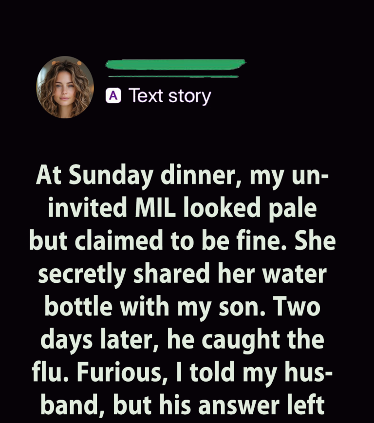 At Sunday dinner, my uninvited MIL looked pale but claimed to be fine. She secretly shared her water bottle with my son. Two days later, he caught the flu.Furious, I told my husband, but his answer left me speechless: “Mom just called me. She’s in the hospital.”