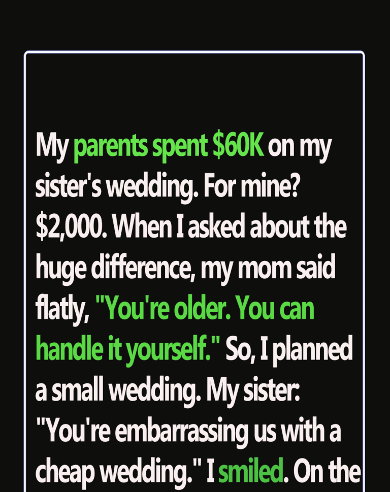 My parents dropped $60,000 on my sister’s wedding three years ago. When I got engaged last year, I assumed they’d contribute similarly. Instead, they handed me a check for $2,000. When I asked about the huge difference, my mom said flatly, “You’re older. You can handle it yourself.”