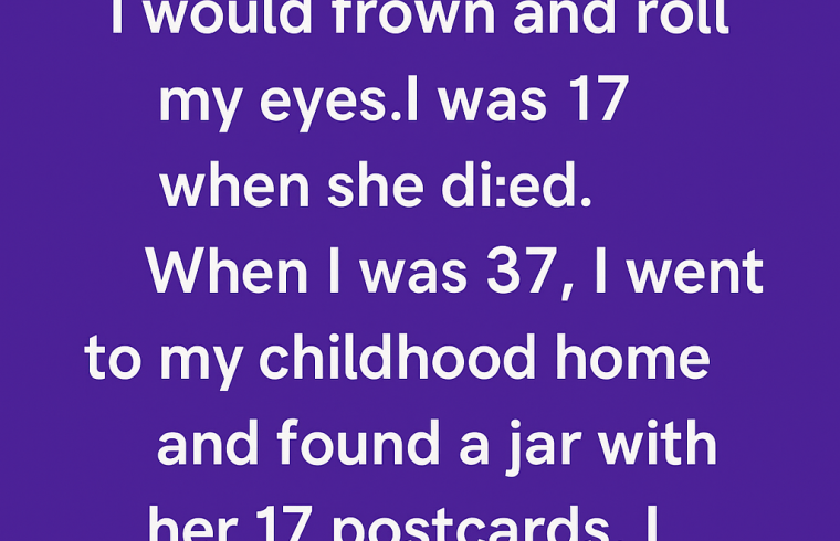 Twenty years later, when I was 37, I went back to my childhood home to clean out the attic. That’s when I found a small glass jar, sealed tight and labeled with my name. Inside were her 17 postcards.