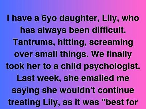 I have a 6-year-old daughter, Lily, who has always been difficult. Tantrums, hitting, screaming over small things. We finally took her to a child psychologist. Last week, she emailed me saying she wouldn’t continue treating Lily, as it was “best for everyone.” I called Dr. Harper again, and she finally revealed that during their last session, Lily had said something that made her deeply uncomfortable.