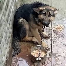 For nearly a decade, Alpha’s existence was confined to a circle barely two meters wide, defined by a thick, rusted chain locked around his neck. He lay on frozen concrete in an abandoned yard—no shelter, barely any food, and not a single gentle hand to touch him. The chain was so short he couldn’t fully stand; when he tried to move, the metal tore into his skin, leaving open wounds that never healed.