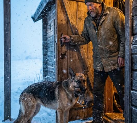 A German Shepherd, black and gold, fur stiff with ice, ribs visible beneath her soaked coat. Her eyes locked onto his—not wild, not aggressive, but focused, calculating, exhausted. In her mouth she held something impossibly small.