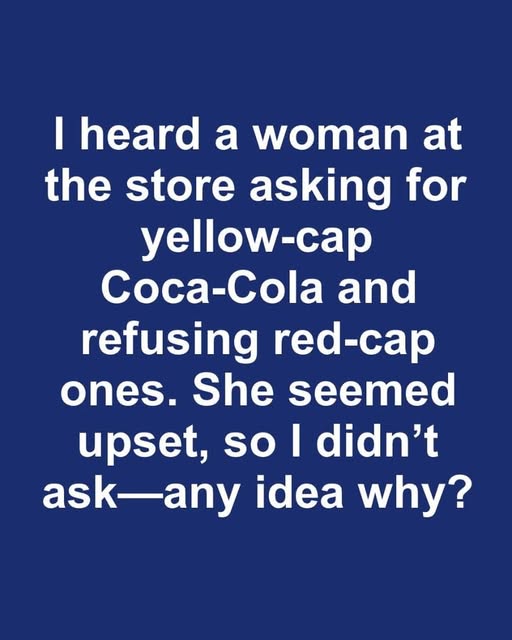 While shopping at my local grocery store, I overheard a woman fervently requesting yellow-cap Coca-Cola and adamantly refusing the red-cap ones. Her insistence and apparent distress piqued my curiosity, but I hesitated to intrude on her privacy by asking for details. This encounter left me wondering about the significance of the yellow-cap Coca-Cola and why someone might have such a strong preference for it.