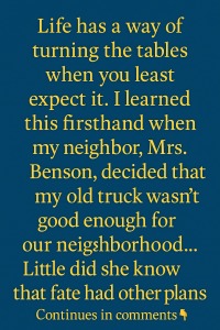 Life has a way of turning the tables when you least expect it. I learned this firsthand when my neighbor, Mrs. Benson, decided that my old truck wasn’t good enough for our neighborhood. Little did she know that fate had other plans.