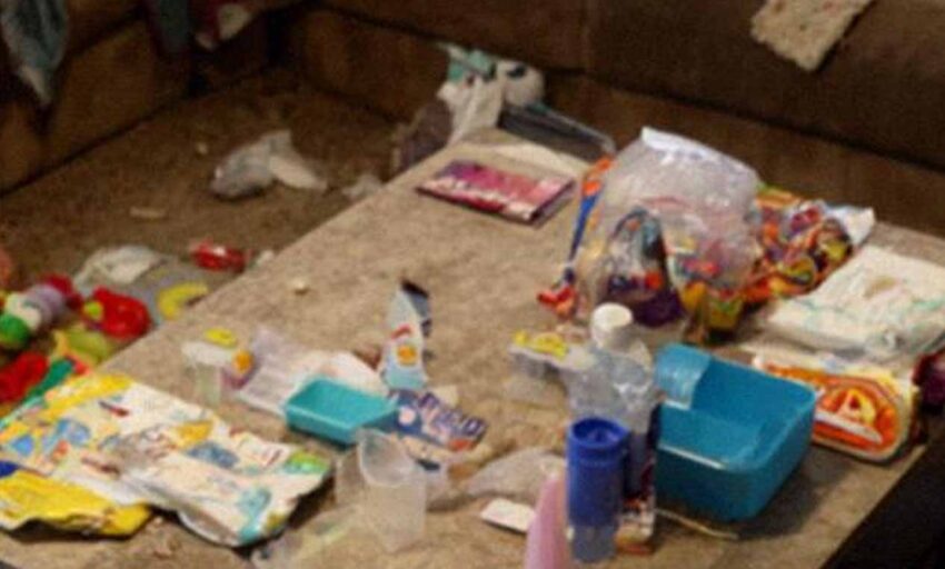 Plates crusted over with dried food (and flies) were on the table, the couch, and the floor. There were crumbs ground into the carpet.