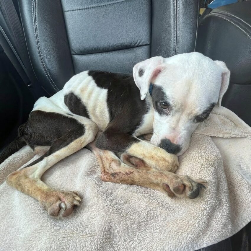 The dog was not just thin—she was emaciated, too weak to even stand. Lying on a blanket outside, the pup wagged her tail faintly as if to say thank you.