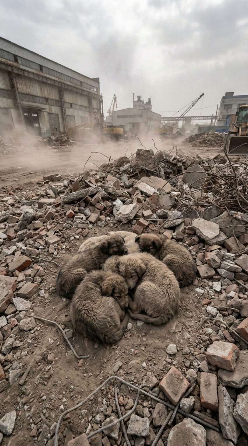 It began with a single, haunting photograph that spread like wildfire across social media in early 2025: a cluster of six tiny, dust-covered  puppies curled into a tight ball atop a mountain of jagged rubble and twisted rebar. The industrial wasteland around them—crumbling factory walls, skeletal cranes frozen mid-swing, bulldozers idling like sleeping giants—looked like the aftermath of an apocalypse. Their fur, matted gray-brown with concrete powder, blended so perfectly with the debris that they seemed almost camouflaged, as if the earth itself had tried to swallow them whole. The image stopped scrollers in their tracks. How had these fragile creatures ended up here? And how were they still breathing?
