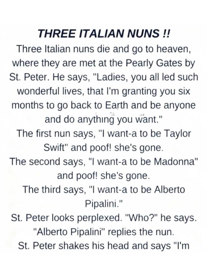 “I want-a to be Alberto Pipalini,” the third nun said softly. St. Peter blinked. He flipped through his records, checked a few heavenly databases, and scratched his head. “I’m sorry, sister,” he said gently, “but I don’t recognize that name. Is he a singer? An artist? A world leader?” The nun smiled wider and calmly pulled out a small newspaper clipping she had somehow brought with her. She pointed to a headline that read: ‘Local Man Alberto Pipalini Named Happiest Person Alive.’ The article explained that Alberto was known not for fame or fortune, but for living a simple, joyful life—running a small family business, laughing often, helping neighbors, and never taking things too seriously.