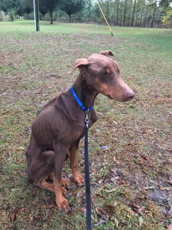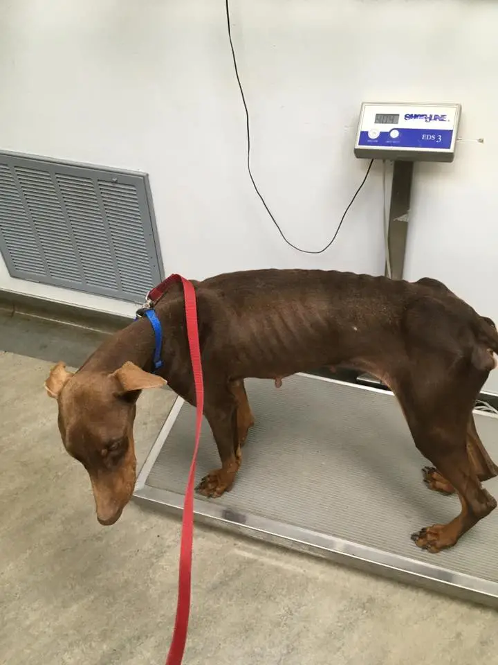 A skeletal Doberman Pinscher stood before him, weighing a mere 37 pounds—less than half of what he should have weighed. His sunken eyes reflected a lifetime of suffering, and his frail body bore the scars of prolonged starvation.