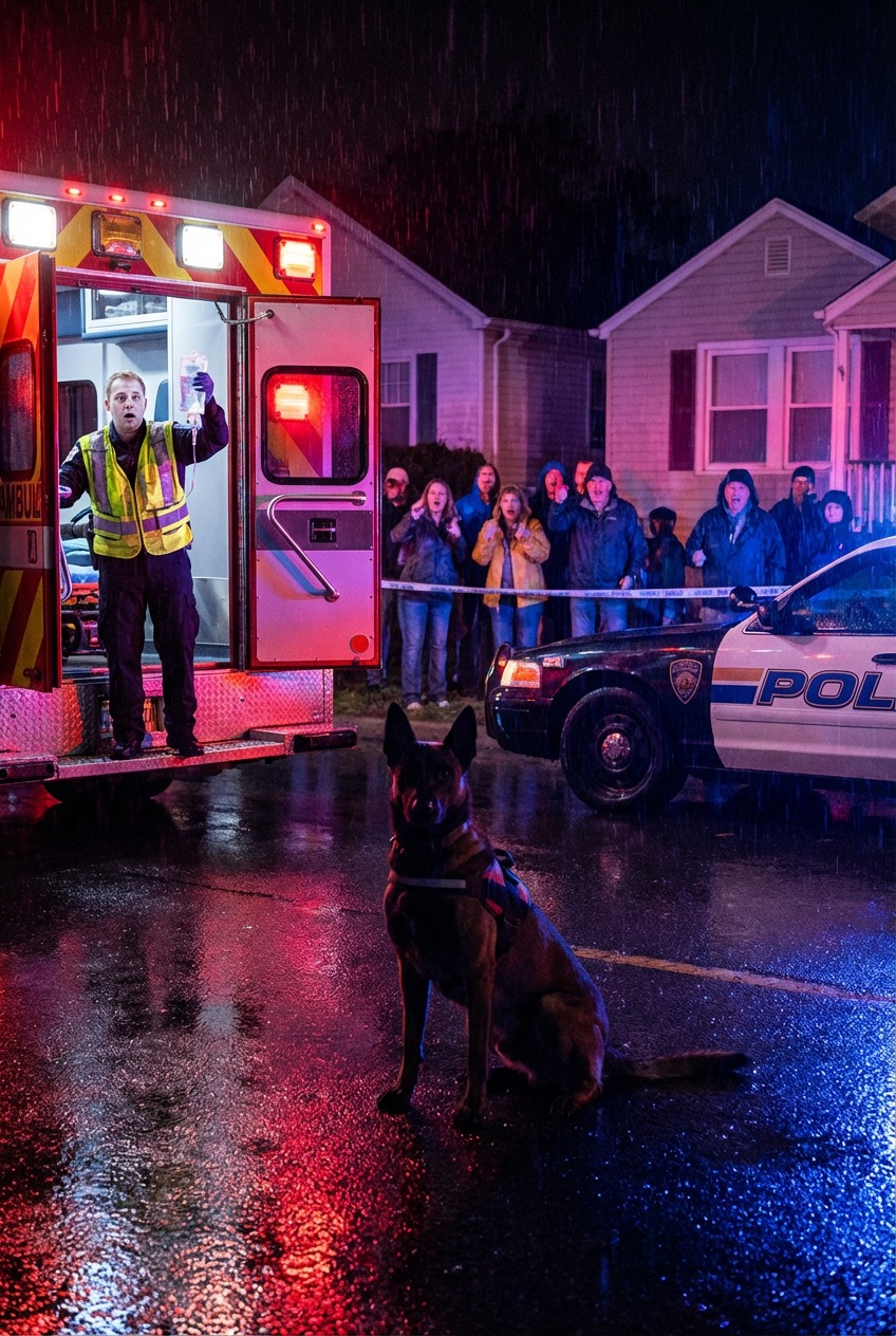 Sirens Blared and the Ambulance Was About to Pull Away When a Dog Planted Himself Behind It—As Bystanders Shouted to Move Him, a Paramedic Glanced Inside, Went Pale, and Whispered, “Stop… Something Isn’t Right,” Halting the Departure at the Final Second