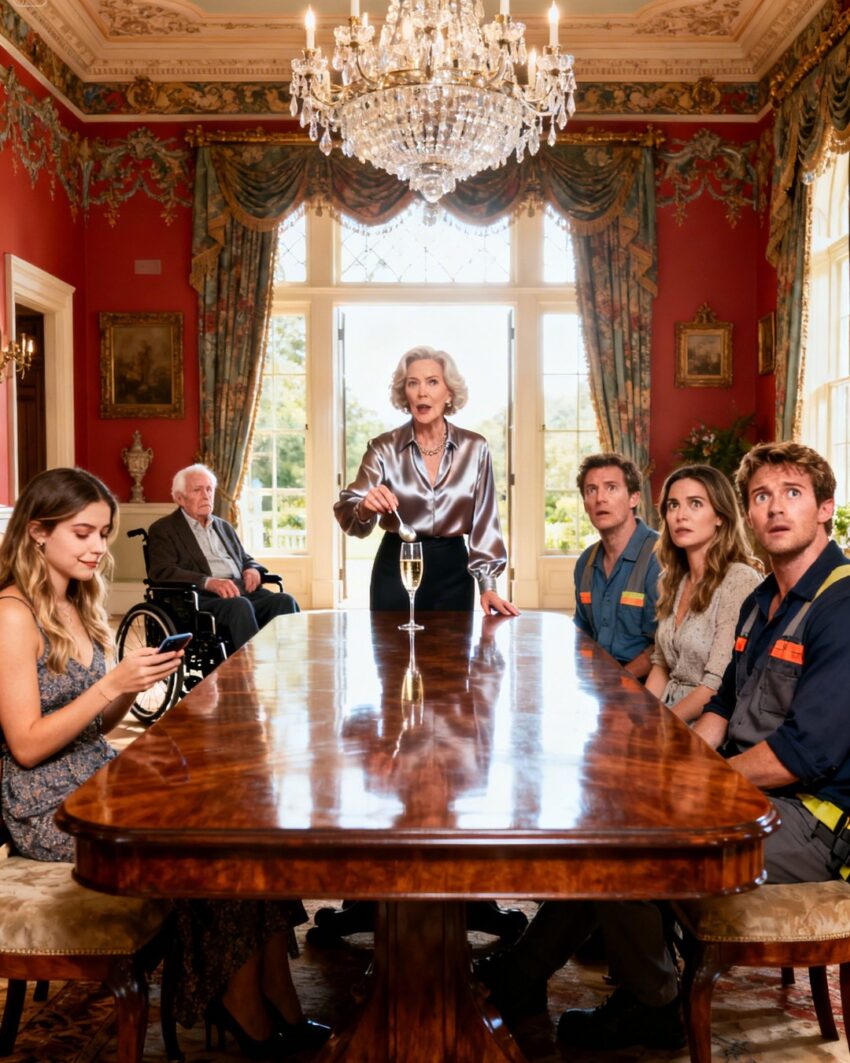 She stood at the head of the table like she’d been born there, as though the carved oak chair had simply sprouted up around her.