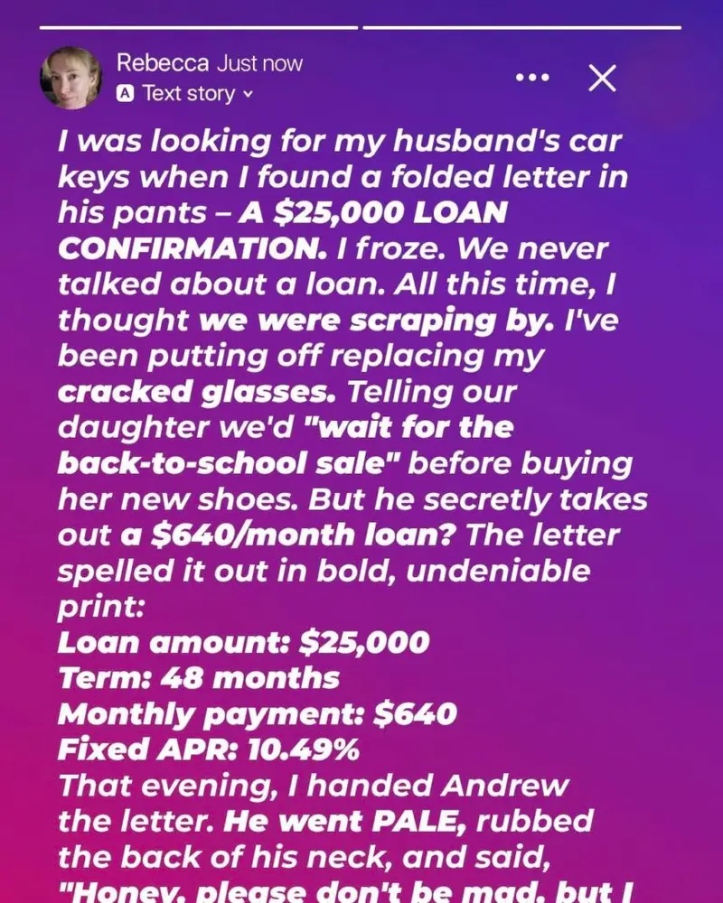 While searching for her husband Andrew’s car keys, a woman stumbled upon a folded letter in his pants—a $25,000 loan confirmation. Shocked and confused, she sat down to process it. They’d been married for 15 years, living frugally with their daughter Emma, barely making ends meet.