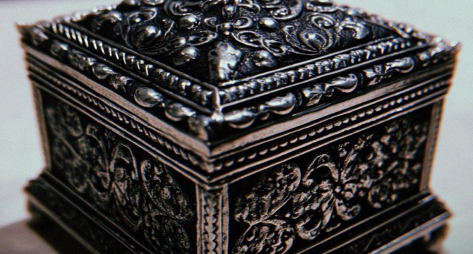 A small metal box with intricate carvings.