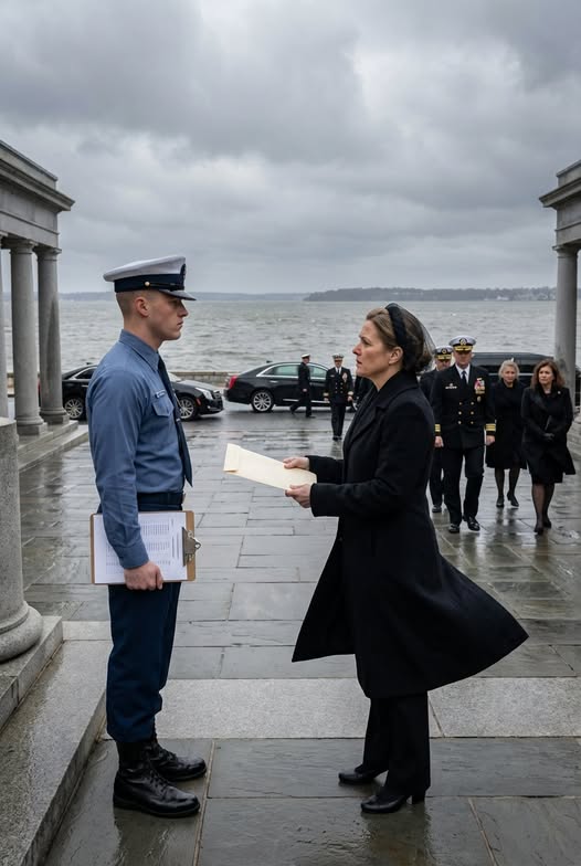 The courtyard was a study in restrained ceremony, gray stone washed in colder gray light as low clouds pressed down over the Severn River, and the wind cut clean and sharp between the columns, carrying the faint brine of the water and the metallic scent of impending rain; black sedans rolled in one after another with quiet authority, doors opening to release admirals in dress blues heavy with medals, senior aides with discreet earpieces, widows draped in veils that fluttered like subdued flags, and in the midst of that measured choreography stood a young security officer with a clipboard, boots polished to a mirror shine, jaw set in the earnest determination of someone entrusted with a perimeter and determined not to fail it.