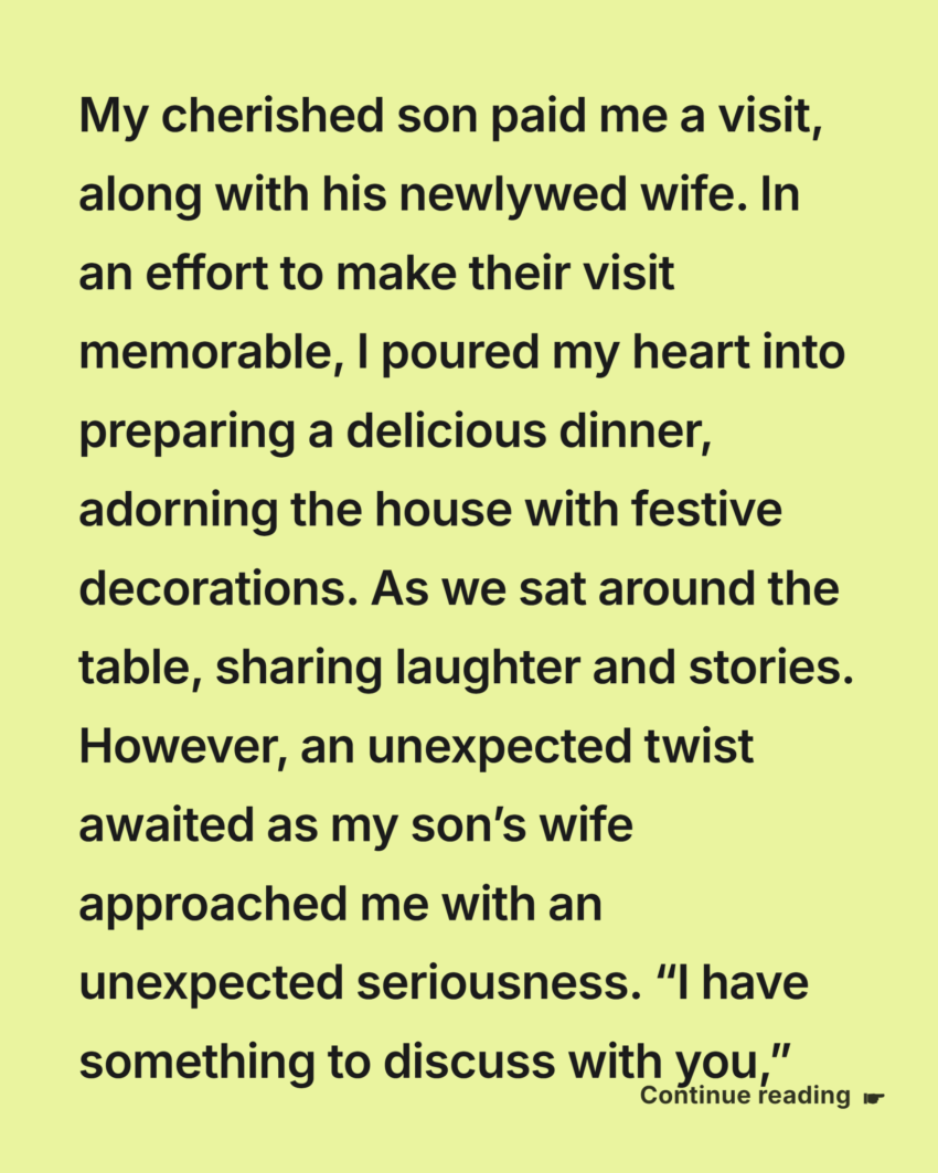 Dinner was wonderful at first. We sat around the table, plates full, glasses clinking softly as we shared stories and laughter. My son talked about work, about the small apartment they had just moved into, about their plans for the future. For a while, I allowed myself to believe that the fragile bond between us all was beginning to take shape.