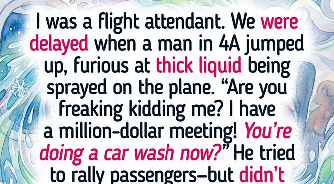 I didn’t snap. I just walked over, leaned down, and looked him dead in the eye until the cabin went silent. I said calmly, “Sir, that liquid is the only thing stopping ice from freezing those wings solid. If I don’t ’wash’ this plane, we won’t just be late—we’ll be a headline before we even hit the clouds.”