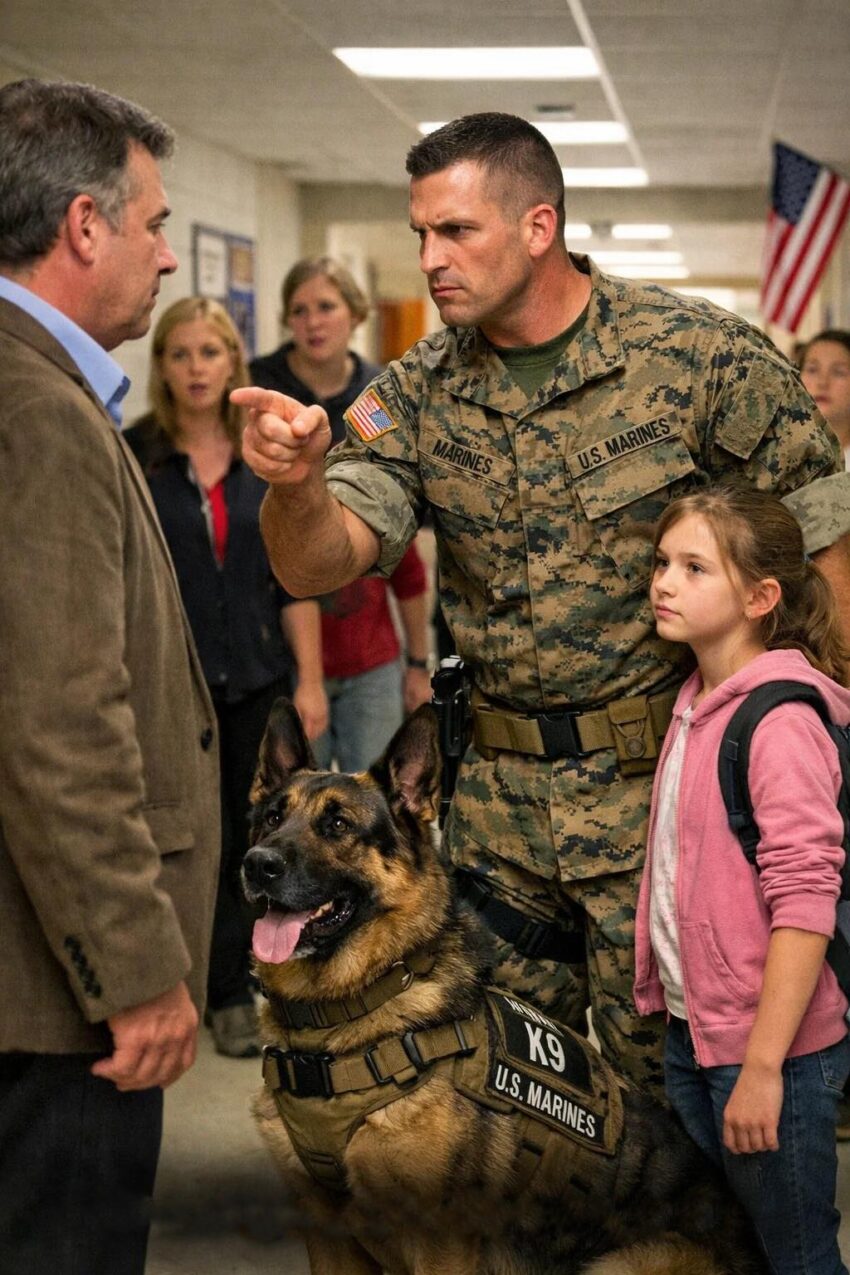 “Apologize to my daughter—right now,” a furious father demanded after a teacher dismissed him as “just a Marine.” Moments later, the Marine arrived at the school with his loyal K9 partner, turning the tense confrontation into something nobody expected.