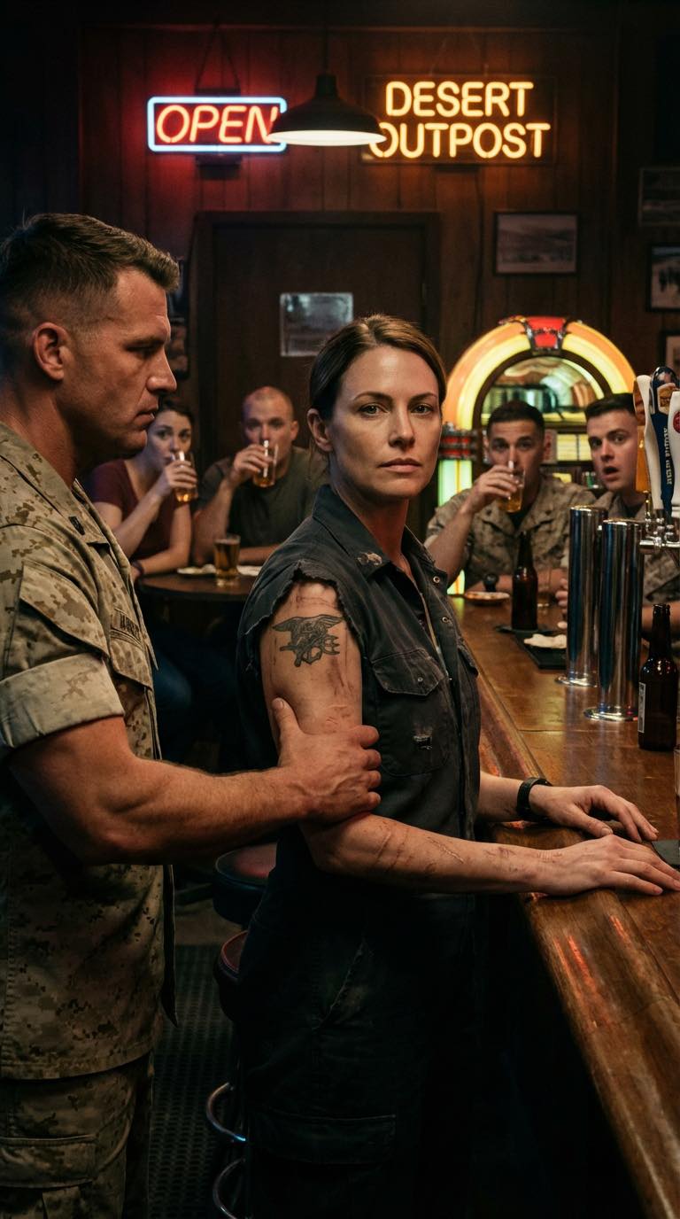 The bar sat on the lonely stretch of highway just outside Fort Calderon, the sort of place that never bothered with fancy names or polished decor because the regulars didn’t care about any of that anyway. Most of them were Marines rotating through training cycles at the base a few miles down the road. Some nights the place was loud enough that the jukebox had to fight to be heard; other nights it carried the calm, tired murmur of soldiers who had spent the day dragging packs through desert heat and now wanted nothing more than cold beer and a chair that didn’t require discipline.