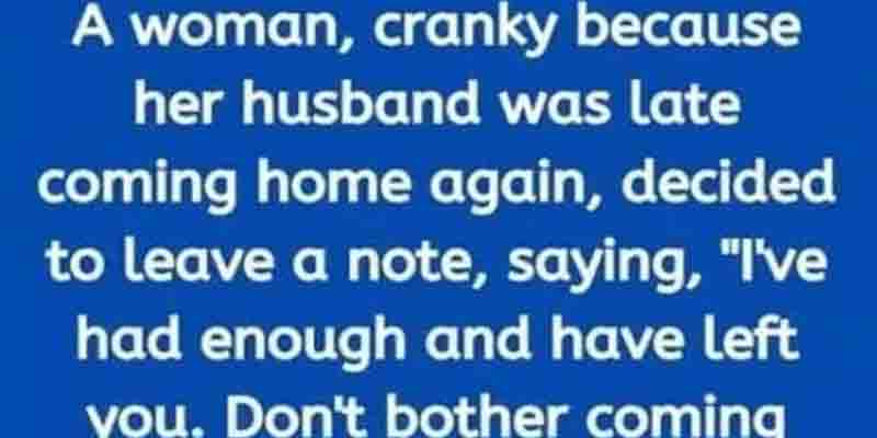 A woman, cranky because her husband was late coming home again, decided to leave a note, saying, “I’ve had enough and have left you. Don’t bother coming after me.”