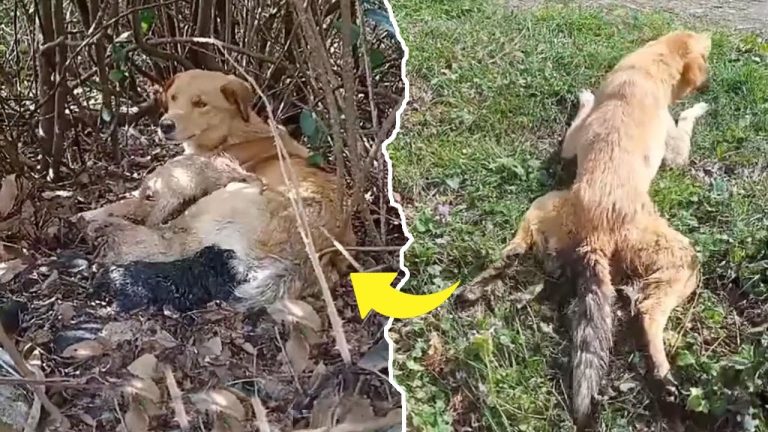 What happened next speaks volumes about her spirit. Unable to walk, she dragged herself across the ground, inch by inch, through mud and debris, driven by a single purpose—to get back to her puppies. Every movement must have been agonizing, yet she refused to stop. When she finally reached them, she didn’t collapse in defeat. Instead, she gathered them close, offering comfort, warmth, and reassurance, as if nothing had changed.
