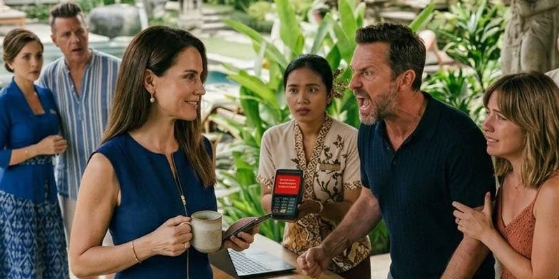 The villa lobby. Derek arguing with a manager. Brooke standing off to the side, mascara running, both suitcases still unopened.