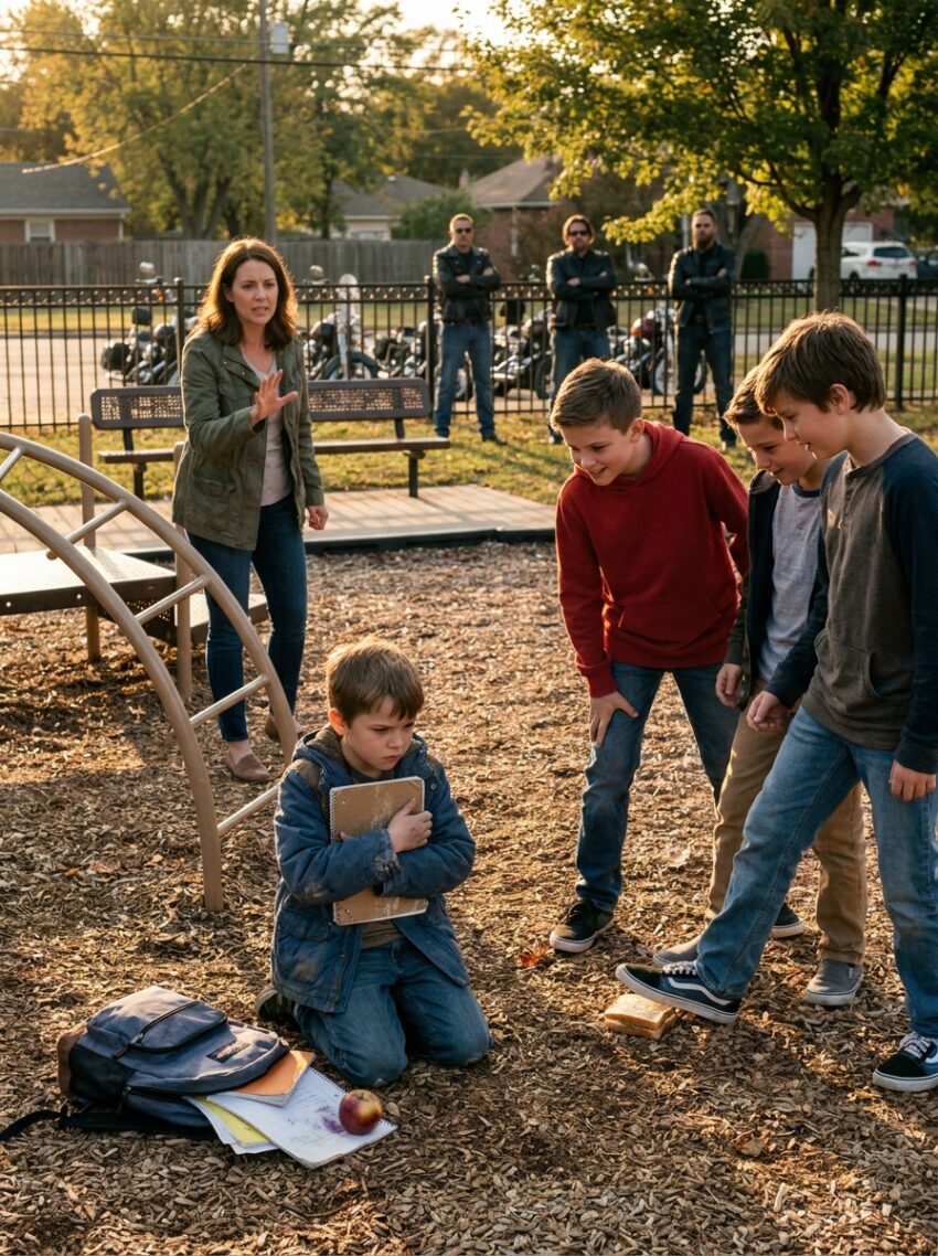 If you had driven past that playground on Maple Ridge Road around four in the afternoon, you probably would’ve slowed down—not because anything looked obviously dangerous at first glance, but because something about the stillness felt off. It wasn’t the kind of quiet that comes from peace; it was the kind that gathers when people are watching something unfold and haven’t yet decided whether to intervene or pretend they didn’t see it. There were children on the swings, a few parents scattered along the benches, and just beyond the low iron fence, six motorcycles lined up in a row, their engines long cooled but their presence impossible to ignore. The men and women standing beside them didn’t look like they belonged to that space, not in the way society likes to define belonging anyway. Leather vests, faded patches, sun-worn faces, arms crossed—not aggressive, not loud, just… there. Watching. Waiting. And inside the playground, near the sandbox where the ground dipped slightly from years of use, a boy no older than nine was being pushed, mocked, and slowly stripped of whatever sense of safety he had walked in with that afternoon.
