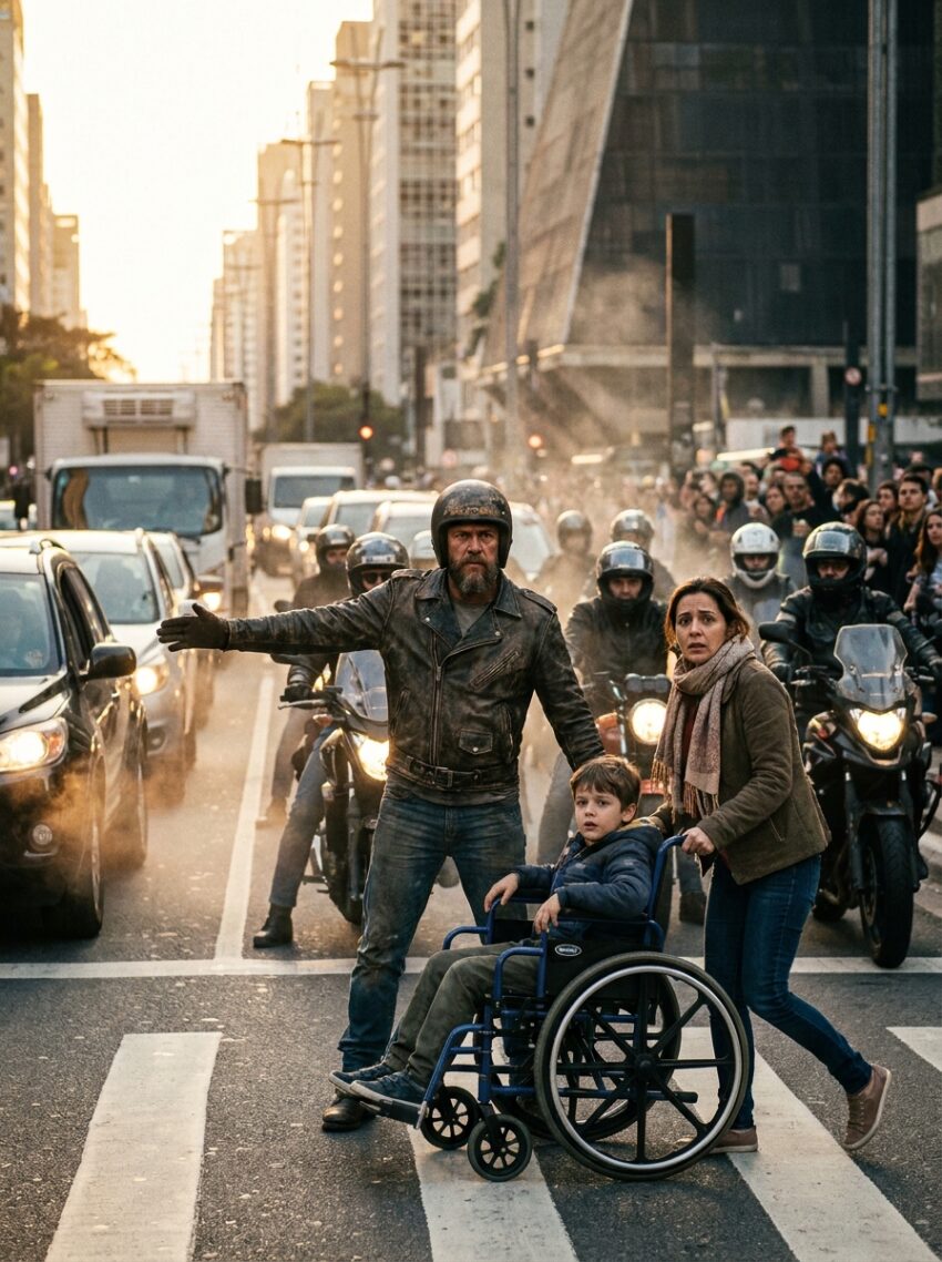 Lillian pushed the wheelchair forward, slowly at first, her movements cautious, as if expecting the moment to collapse at any second. Mateo looked around, his earlier fear replaced by something closer to wonder, his eyes tracking the line of bikers who now formed a loose, protective corridor around them.